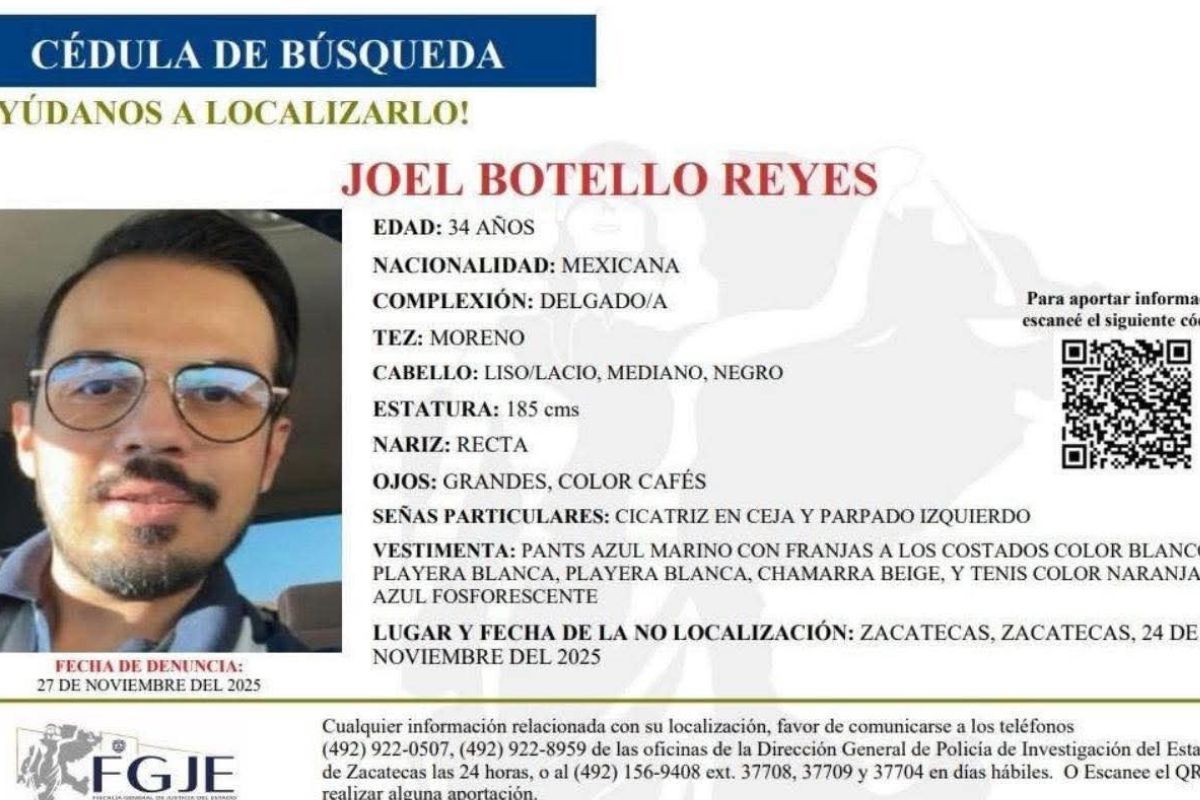 ZACATECAS.- Autoridades estatales desplegaron este lunes un operativo de búsqueda de personas en vida en los municipios de Tabasco y Villanueva, con el objetivo de obtener información que ayude a localizar a Joel Botello, reportado como desaparecido recientemente.