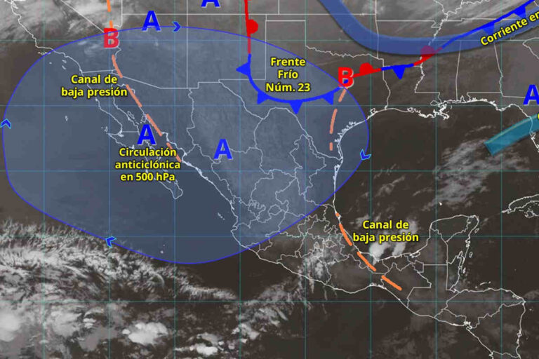 Finalmente, una circulación anticiclónica en niveles medios de la atmósfera, ocasionará tiempo estable y sin lluvia sobre entidades del noroeste, norte y occidente del territorio nacional, así como un ascenso de las temperaturas vespertinas; no obstante, persistirá ambiente frío a muy frío durante la mañana y noche en la mayor parte de los estados del norte y centro de México, así como ambiente gélido con temperaturas mínimas menores a -5 °C y heladas en zonas serranas de Chihuahua y Durango.