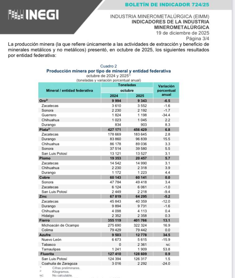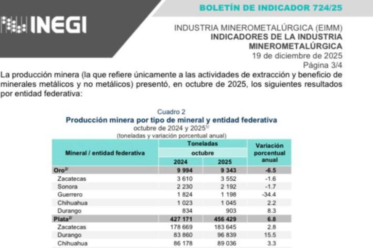 El informe señala que la producción nacional de plata creció 4.5% anual en octubre de 2025, pasando de 323,972 a 338,492 kilogramos. En Zacatecas, la producción aumentó 2.8%, de 178,669 a 183,645 kilogramos, consolidando al estado como pilar estratégico para la industria minera nacional.