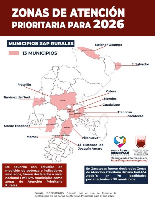 Entre los municipios rurales señalados se encuentran Melchor Ocampo, El Salvador, Jiménez del Teul, Monte Escobedo, Momax, Villanueva y El Plateado de Joaquín Amaro, además de zonas específicas en Fresnillo, Calera, Morelos, Guadalupe, Trancoso y la capital zacatecana. Estas áreas fueron determinadas con base en el Decreto publicado en el Diario Oficial de la Federación, el cual establece a nivel nacional 11 mil 575 municipios como Zonas de Atención Prioritaria para 2026.