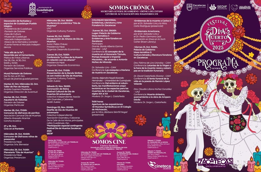 ZACATECAS.- Con una amplia cartelera de actividades culturales, artísticas y gastronómicas, el Gobierno del Estado, invita al Festival de Día de Muertos 2025, que se realizará del 27 de octubre al 3 de noviembre en distintos puntos del estado.