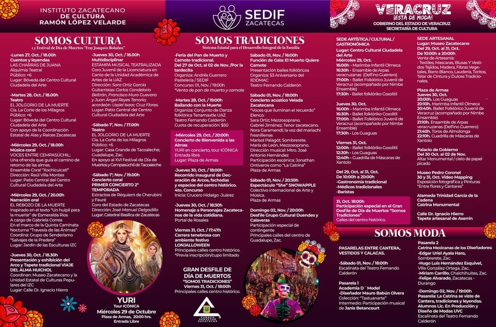 Como parte de Somos Moda, habrá pasarelas de diseñadores zacatecanos en el Teatro Fernando Calderón, y el municipio de Guadalupe se sumará con su propio Desfile de Día de Muertos el domingo 2 de noviembre.