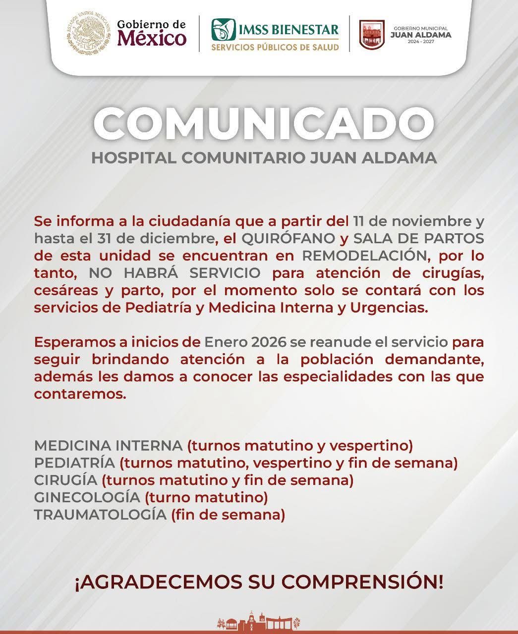 Juan Aldama, Zac.— El Hospital Comunitario de Juan Aldama informó que a partir del 11 de noviembre y hasta el 31 de diciembre permanecerán suspendidos los servicios de quirófano y sala de partos debido a trabajos de remodelación que actualmente se realizan en estas áreas.