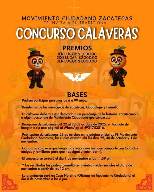Podrán participar personas de 6 a 99 años de los municipios de Zacatecas, Guadalupe y Fresnillo, dedicando sus calaveras a personajes históricos del estado o a figuras representativas de Movimiento Ciudadano.