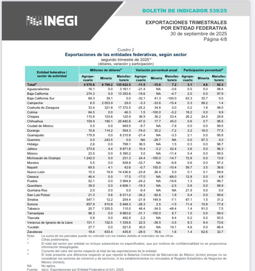 De acuerdo con el boletín del INEGI sobre Exportaciones Trimestrales por Entidad Federativa (ETEF), las exportaciones del estado crecieron 37.1 % respecto al mismo periodo del año anterior, posicionándose entre los cinco estados con los incrementos más altos del país.