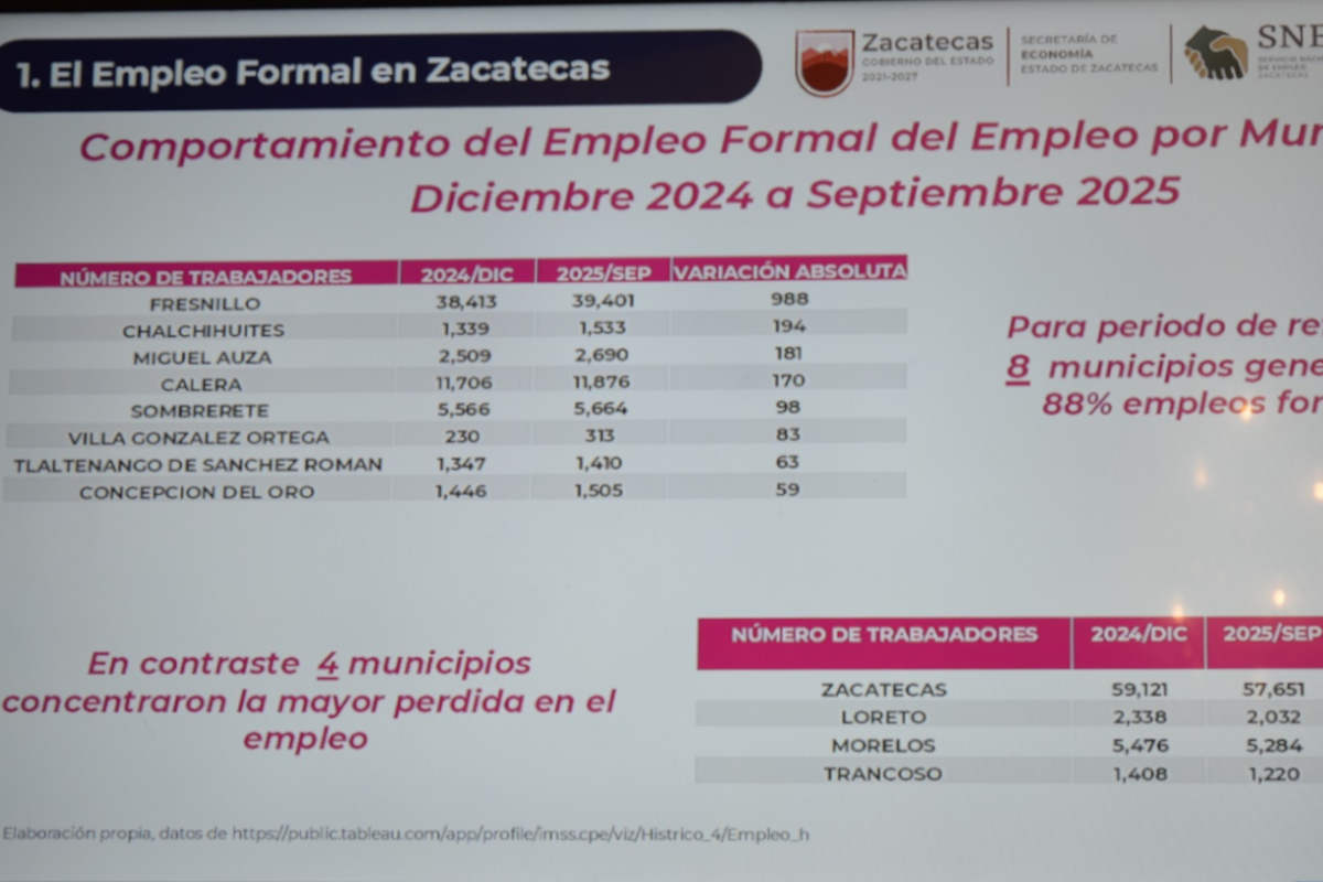 No obstante, algunos municipios como Loreto, Morelos y Trancoso registraron un decremento de mil 400 empleos. Aun así, las industrias extractivas, de la construcción y de servicios para empresas y hogares muestran señales de recuperación rumbo a diciembre.