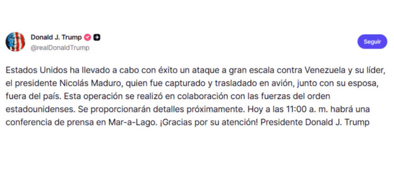 Pocas horas después de los bombardeos, el presidente de Estados Unidos, Donald Trump, utilizó sus redes sociales para anunciar lo que calificó como una “misión de liberación”. Según el mandatario, Nicolás Maduro y su esposa, Cilia Flores, fueron capturados y trasladados fuera de territorio venezolano en una aeronave militar.