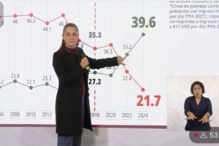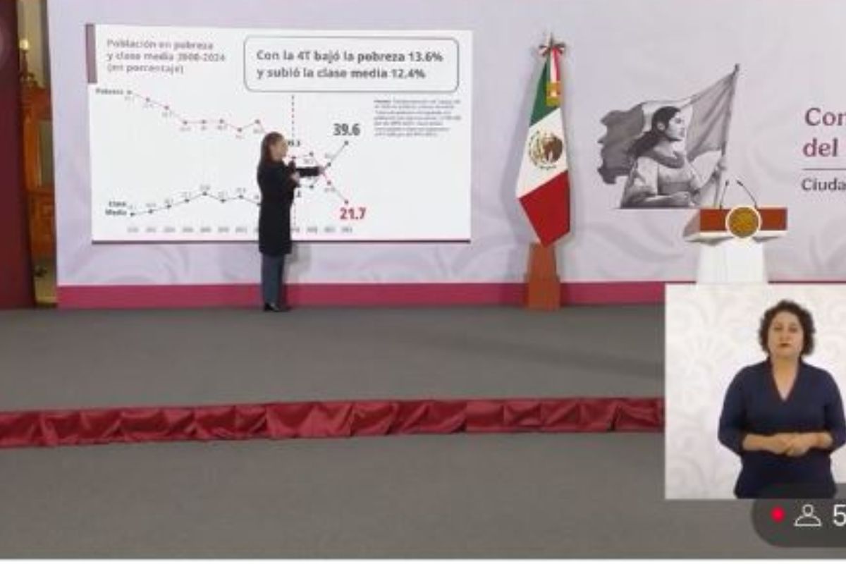 La presidenta comparó estos resultados con administraciones anteriores, al recordar que en el año 2000 la clase media representaba apenas 18.1% de la población, mientras que la pobreza alcanzaba 55.1%. Durante el sexenio de Enrique Peña Nieto, las cifras se ubicaron en 27.2% de clase media y 35.3% de pobreza. El punto de cruce histórico, añadió, se registró entre 2020 y 2022, con un repunte significativo en 2024.