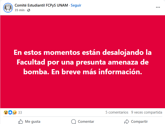 A través de la cuenta de Facebook del Comité Estudiantil de la Facultad de Ciencias Políticas y Sociales, se informó sobre el desalojo también para prevenir a los estudiantes.