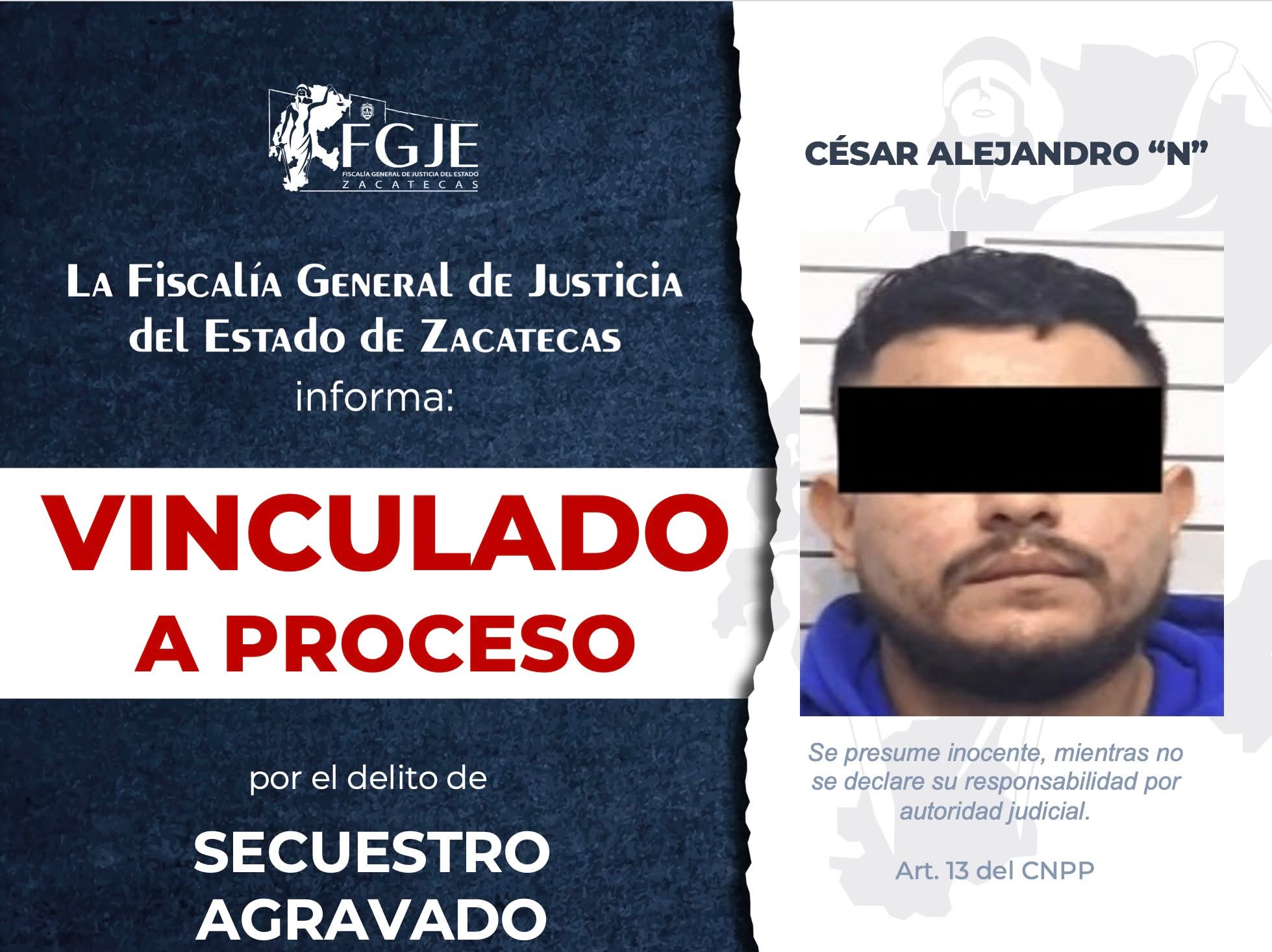 Zacatecas, Zac.– La Fiscalía General de Justicia del Estado de Zacatecas (FGJEZ) obtuvo la vinculación a proceso de César Alejandro “N” por su probable responsabilidad en el delito de secuestro agravado, por lo que un juez le impuso la medida cautelar de prisión preventiva.