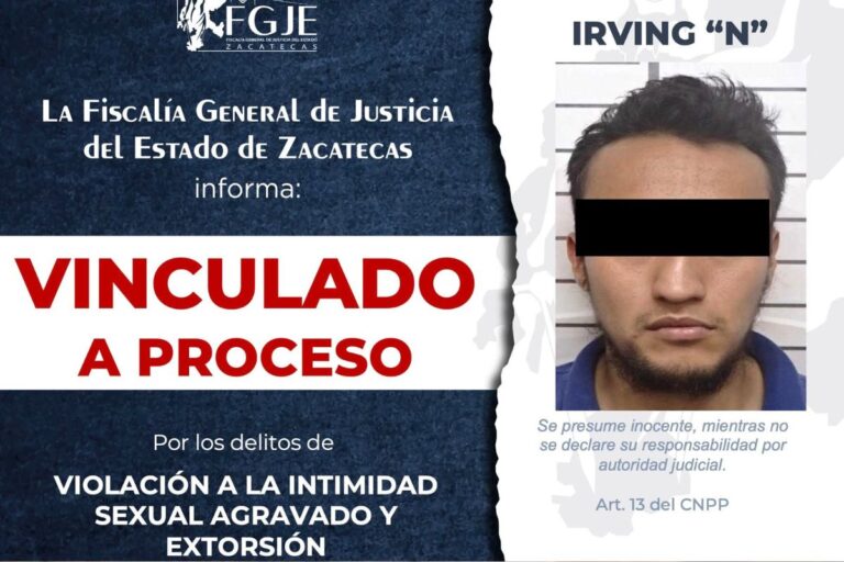 ZACATECAS. La Fiscalía Especializada en Atención de Delitos contra las Mujeres por Razones de Género obtuvo la vinculación a proceso en contra de Irving “N”, señalado como presunto responsable de los delitos de violación a la intimidad sexual agravada y extorsión en perjuicio de dos personas.