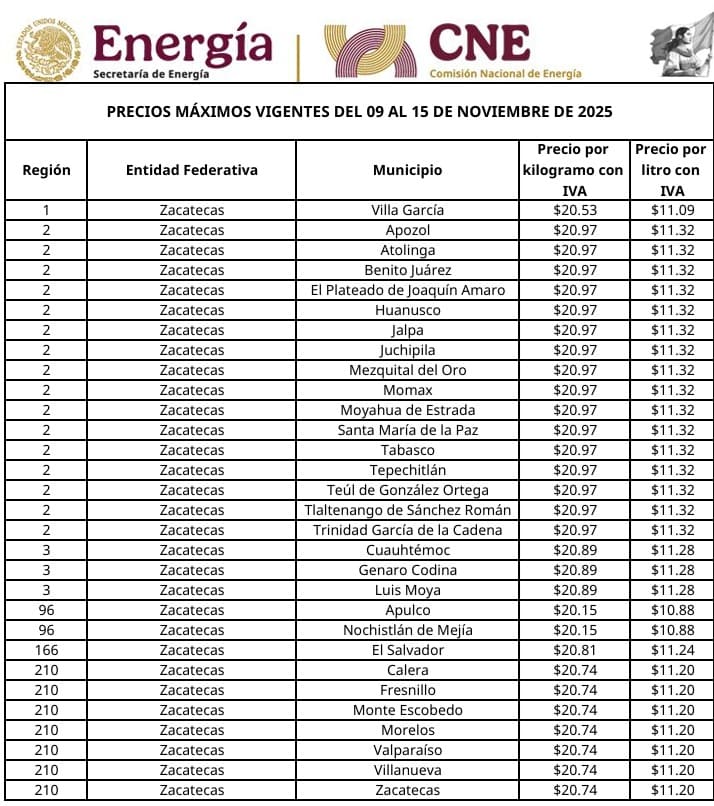 La Comisión Reguladora de Energía compartió cuáles son los precios máximos vigentes del 9 al 15 de noviembre de 2025, en cada región de Zacatecas.