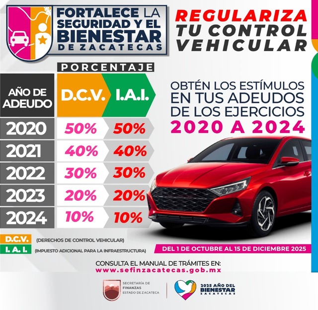 El programa contempla estímulos fiscales aplicables del 1 de octubre al 15 de diciembre de 2025, que permitirán a las y los contribuyentes ponerse al corriente en sus adeudos de Control Vehicular y, con ello, prevenir el uso de unidades irregulares en actos delictivos.