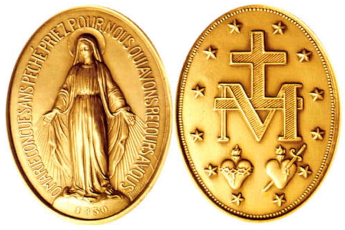 Asimismo una voz dijo a Catalina: “Hay que hacer una medalla semejante a esto que estás viendo. Todas las personas que la lleven, sentirán la protección de la Virgen”, y apareció una M, sobre la M una cruz, y debajo los corazones de Jesús y María. Es lo que hoy está en la Medalla Milagrosa.