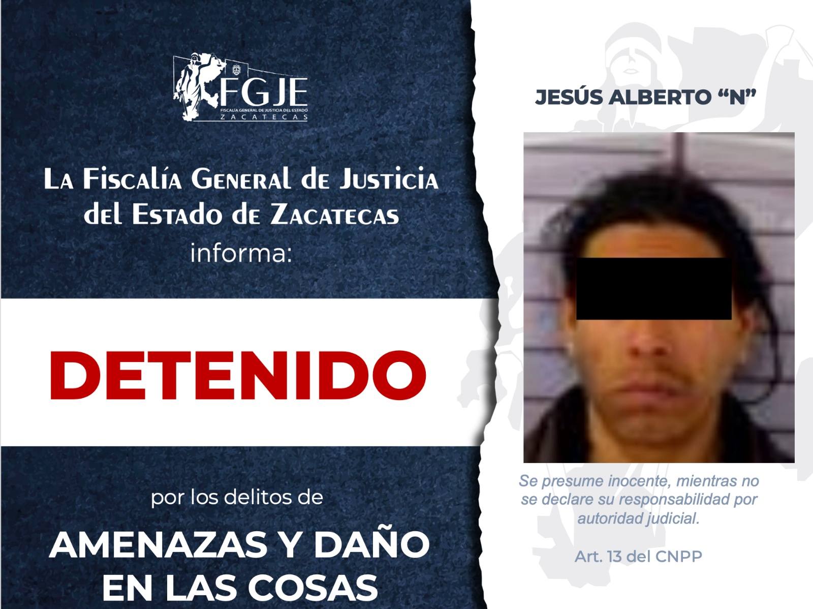 Jesús Alberto “N”, detenido en Fresnillo, Zacatecas, por amenazas y daño en las cosas.
