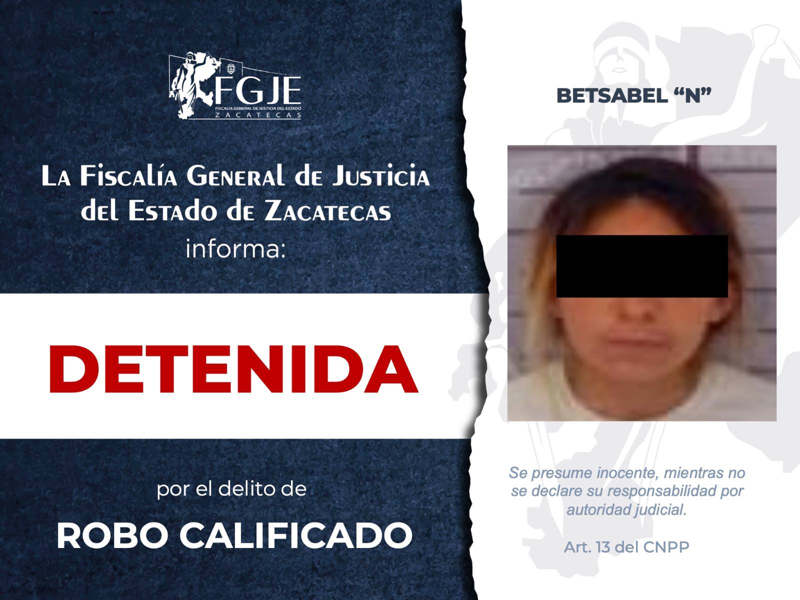 Betsabel “N”, detenida en Fresnillo, Zacatecas, por robo calificado.